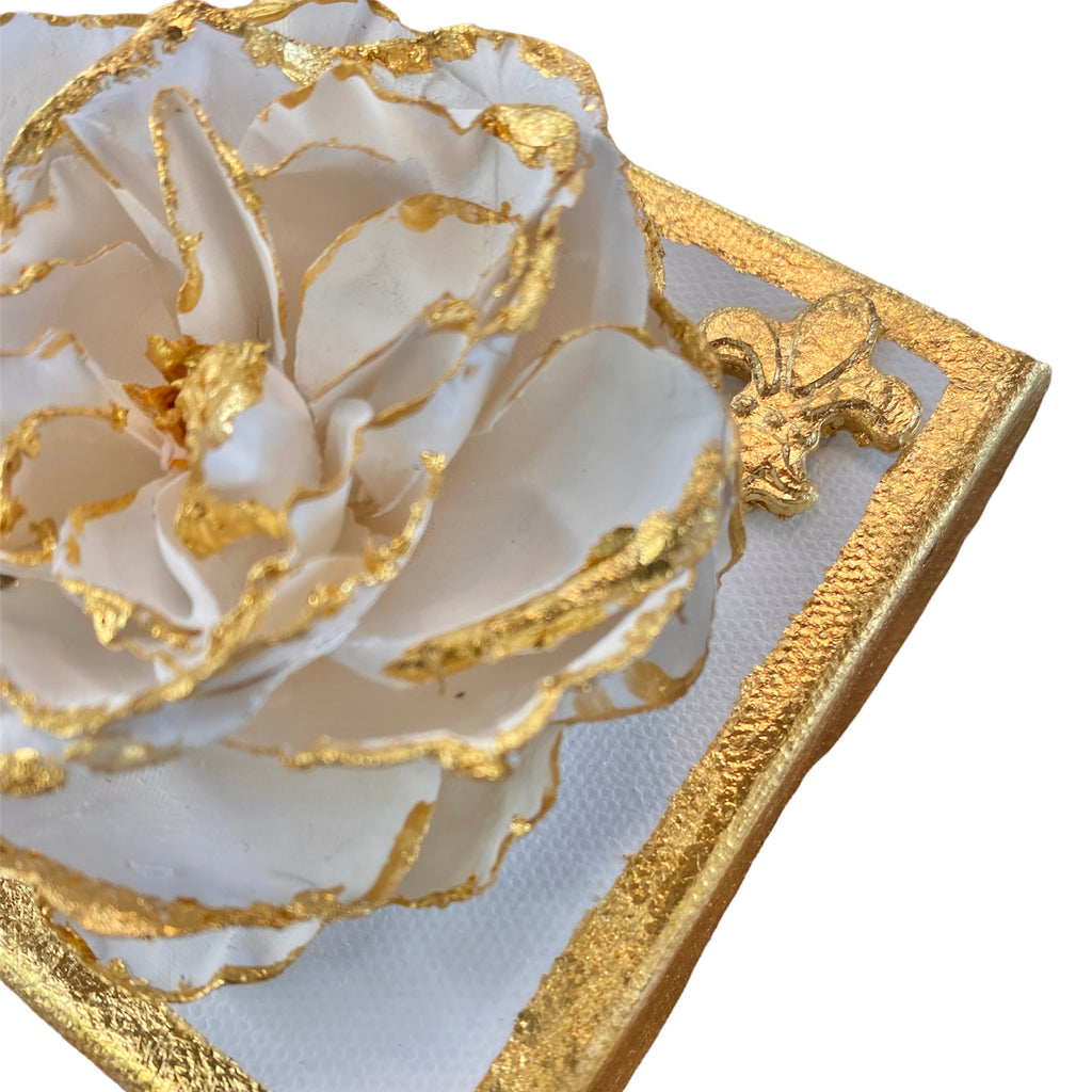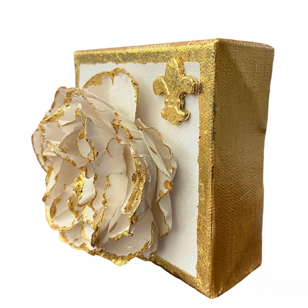 These 4"x4" flowers on canvas are handmade by local Metairie, LA artist, Diane Triay. They are perfect for hanging on a wall, putting on a bookshelf, or decorating a table. The white and gold color scheme makes them wonderfully versatile and beautiful!